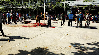 pelaksanaan qurban itu berlangsung sengan sangat hikmat dan di iringi kumandang takbir yg bergema ,menandakan berlangsungnya ibadah tersebut.