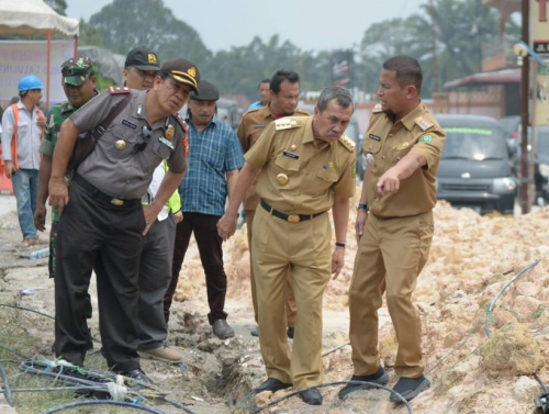 Saat meninjau bahu jalan ynag runtuh tersebut, Syamsuar didampingi Kepala Dinas PUPR Riau Dadang Eko Purwanto, Kepala Dinas Perhubungan Riau Taufiq OH, dan Camat Kandis Irwan Kurniawan, serta sejumlah pejabat terkait lainnya. (grc)