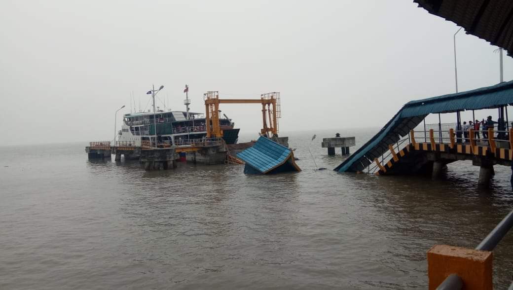 Lumpuhnya aktifitas penyeberangan roro yang melayani tiga daerah, karena jembatan penyeberangannya roboh diduga akibat ditabrak kapal roro yang akan bersandar.