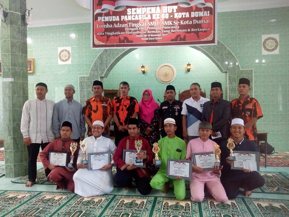 Pengumuman pemenang Lomba Adzan yang dipusatkan di Masjid Darul Djadid, Kelurahan Bintan, Kecamatan Dumai Kota dihadiri oleh Walikota Dumai yang diwakili Assisten II, Dandim 0320/Dumai Letkol Inf Irdhan SE MM, Kapolres Dumai AKBP Andri Ananta Yudhistira SIK MH, Anggota DPRD Dumai Rudi Hartono S.Psi, Pimpinan Masjid Darul Djadid H Sukma Jaya Arief SE dan pimpinan dan pengurus MPC PP Dumai, pada Sabtu (09/11).