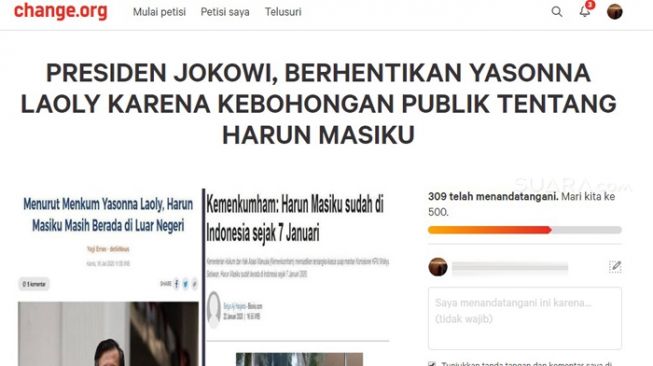 "Kami sebagai kumpulan warga negara yang peduli pada perang melawan korupsi meminta Presiden Jokowi memberhentikan Menteri Hukum dan Hak Asasi Manusia, Yasonna Laoly, karena kasus kebohongan publik bahwa tersangka korupsi Harun Masiku berada di luar negeri sejak 6 Januari 2019," demikian pargraf pertama mukadimah petisi tersebut.
