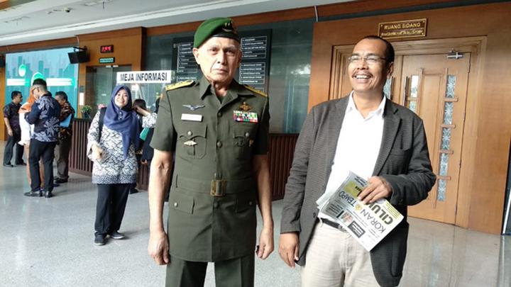 Kivlan mengaku belum sehat hari ini. Dia terlihat berjalan menuju pengadilan menggunakan tongkat ditemani sang istri. "Belum sehat, tapi karena kehormatan dan harga diri saya sehat," ucap dia.