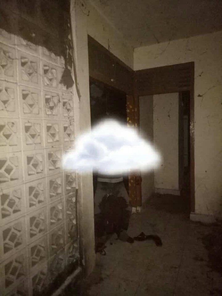 Posisi mayat dengan terjulur lidah dengan wajah yang sudah menghitam ini, ditemukan dirumah kosong dengan menggunakan baju kaos lengan panjang belang belang. Tampak kondisi mayat menggenaskan dan mengeluarkan aroma yang tidak sedap.