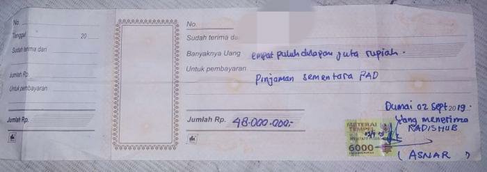 Kwitansi yang tidak menyebutkan siapa yang menyerahkan sejumlah uang ini, jelas dituliskan sebesar Rp. 48.000.000 (Empat Puluh Delapan Juta Rupiah) dengan menyebutkan tanggal diterima kadishub pada 20 September 2019. Sebenarnya, kejadian peminjaman ini adalah yang kedua kalinya dilakukan Asnar pada tahun 2013. Saat itu, Asnar juga menjabat sebagai Sekretaris Dinas Perhubungan Kota Dumai.