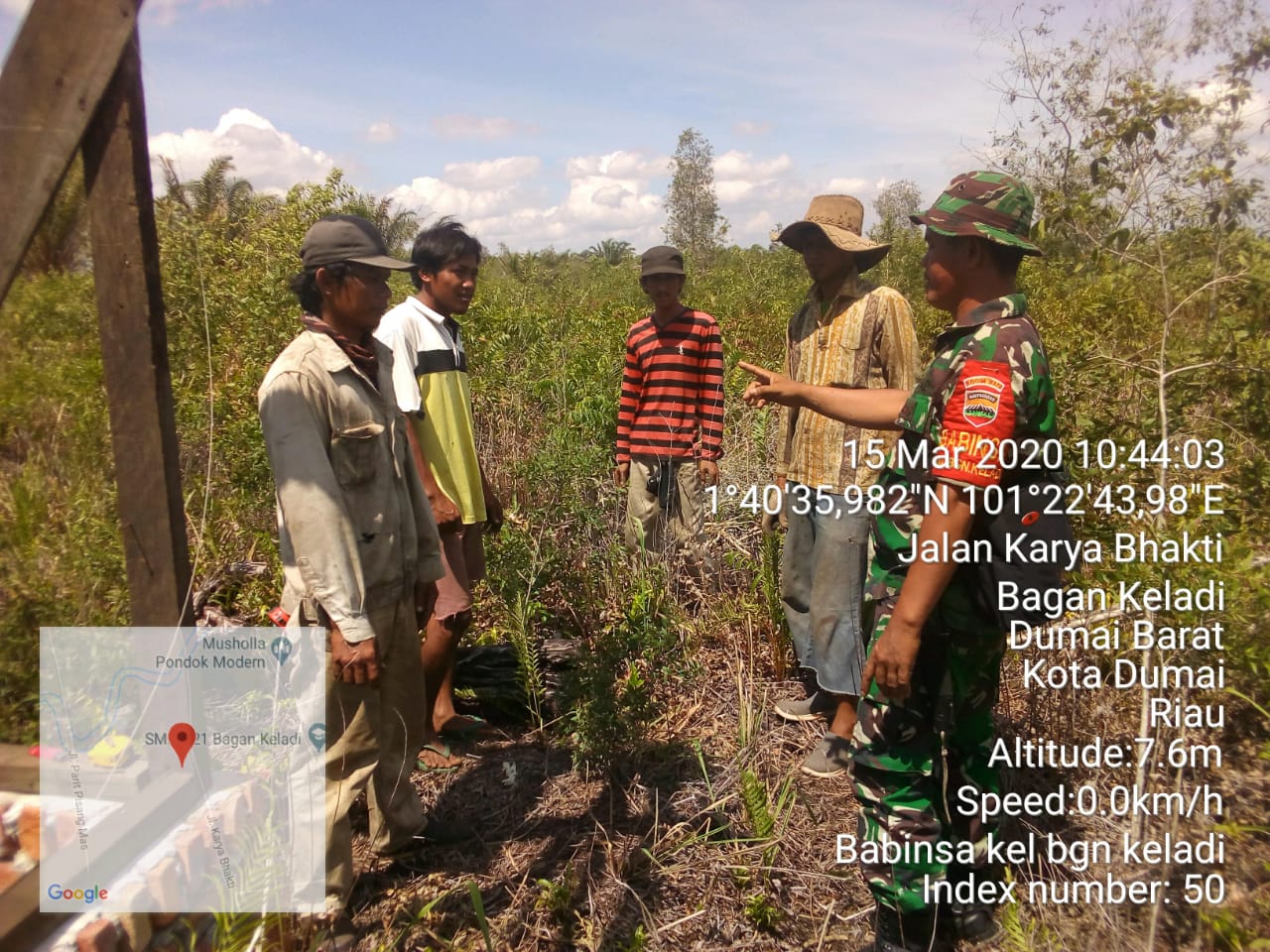 Dumai (PantauNews.co.id) - Dalam rangka pencegahan dini tingkat Kebakaran lahan dan Hutan (Karhutla), Babinsa Bagan Keladi bersama Koramil 01/Dumai serta jajaran Kodim 0320/Dumai Koptu Hendra melaksanakan sosialisasi dan Komsos. Pencegahan Karhutla dengan melibatkan masyarakat tepatnya berada di lokasi Jalan Karya Bhakti RT 06, Kelurahan Bagan Keladi Kecamatan Dumai Barat, Minggu (15/03/2020).