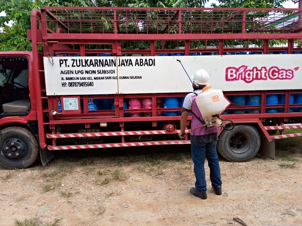 Dumai (PantauNews.co.id) – Ikut mencegah penyebaran virus Corona atau Covid-19, PT Zulkarnain Jaya Abadi melakukan penyemprotan disinfektan diperkarangan kantornya dan juga armada yang menjadi angkutan pendistribusian LPG.
