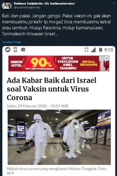 Hal itu disampaikan Budiman melalui cuitan di akun Twitter pribadinya @budimandjatmiko. Ia menyertakan bidikan layar artikel JPNN.com mengenai temuan vaksin virus corona Israel yang akan segera dijual ke pasaran.