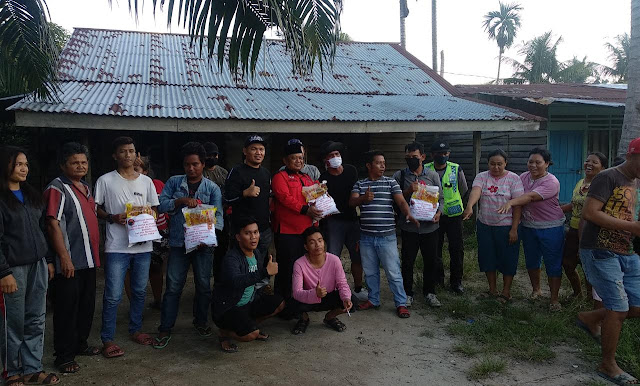Peket sembako yang dibagikan kemasyarakat untuk 100 KK (Kepala Keluaga) yang berada di Kelurahan Teluk Binjai. Turut juga menyaksikan pembagian sembako, Bhabinkamtibmas Polsek Dumai Timur Bripka Hardianto Silaban.