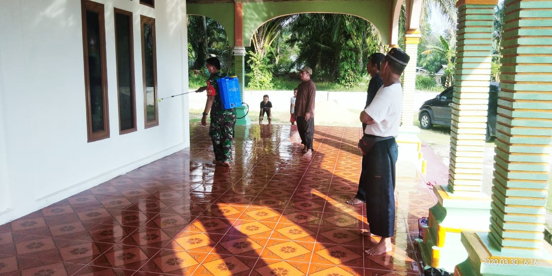 Dumai (PantauNews.co.id) – Untuk memutuskan mata rantai penyebaran virus corona (Covid-19), Babinsa Kampung Baru Serda Roni, pimpin penyemprotan desinfektan di tempat tempat rumah ibadah, Senin (30/03/2020)