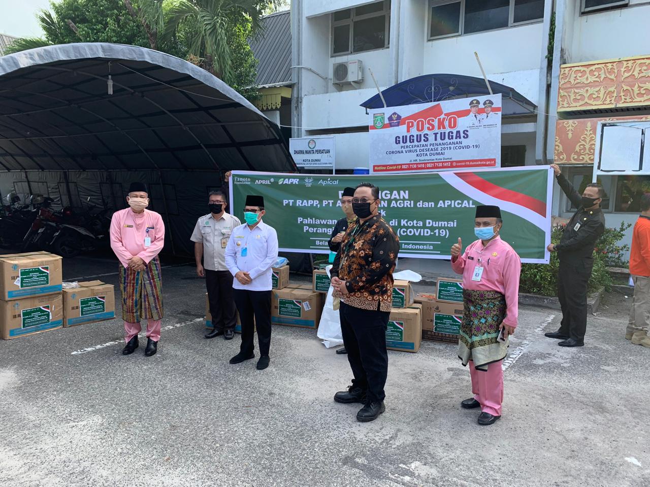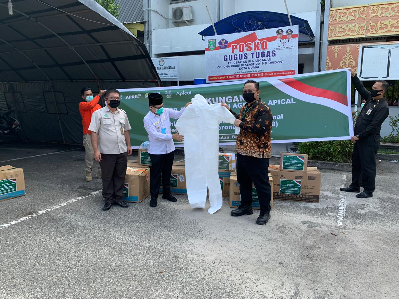 Untuk Kota Dumai, bantuan 950 baju pelindung/ hazmat, 10 ribu masker, 10 ribu sarung tangan, 50 kaca mata medis diserahkan oleh Alvin Yulityas Sandy, selaku perwakilan dari Apical Group kepada Walikota Dumai Zulkifli AS.