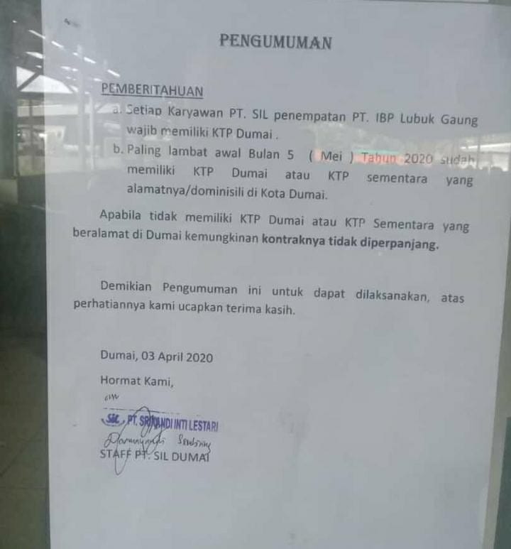 Saat ditemukan pengumuman yang dikeluarkan dan ditandatangi oleh manajemen PT SIL pada tanggal 03 April 2020, terpampang jelas pemberitahuan bahwa setiap karyawan PT SIL penempatan PT IBP Lubuk Gaung wajib memiliki KTP Dumai. Selanjutnya, karyawan PT SIL diminta menyerahkan paling lambat awal bulan 5 (Mei) tahun 2020 sudah memiliki KTP Dumai atau KTP sementara yang alamatnya atau domisili di Kota Dumai.