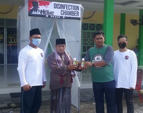 "Sebelum jemaah memasuki masjid, hendaklah melewati bilik disinfeksi agar pakaian jemaah steril dari virus. Disinfection Chamber ini adalah salah satu upaya kita untuk pencegahan Covid-19, bahan cairan yang diguna adalah cairan antiseptik agar lebih aman digunakan bagi kulit manusia," ujarnya Hebat merupakan tagline (Hendri Sandra Bersama Rakyat).