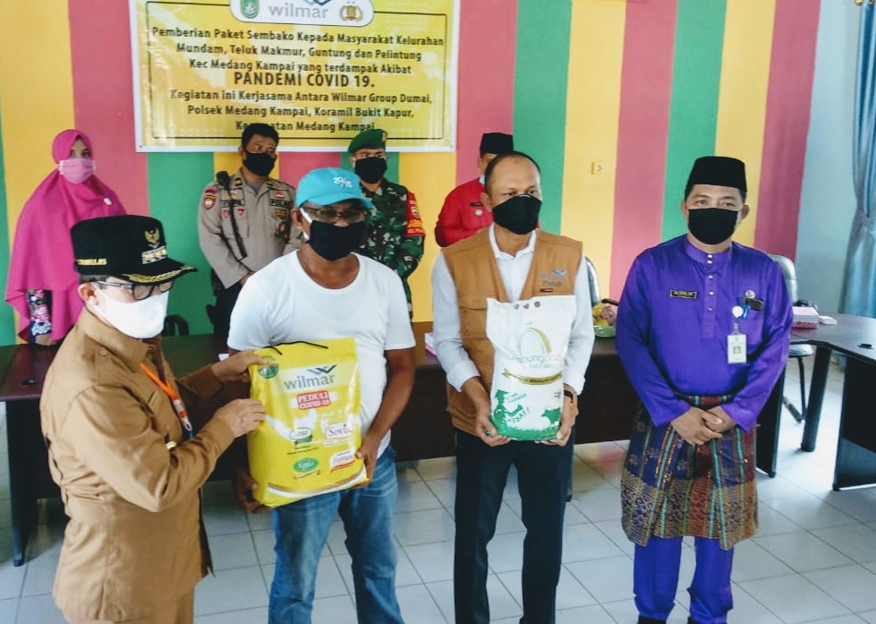 Dumai (PantauNews.co.id) - Menanggulangi dampak ekonomi sosial yang diakibatkan oleh virus corona atau Covid-19, Wilmar Dumai - Pelintung menyalurkan bantuan sembako kepada warga Kecamatan Medang Kampai dan Dumai Timur.