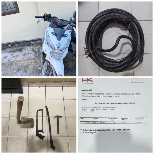Kasus tersebut bermula pada Sabtu, 20 Desember 2025, sekitar pukul 02.14 WIB, ketika petugas Piket Kamtib Ranting III Tol Permai berhasil mengamankan seorang pria berinisial AL AWI Als AWI Bin Fredi Bakar yang tertangkap tangan saat melakukan pencurian kabel PJU di Jalur B akses keluar Gerbang Tol Dumai. Kabel yang dicuri diketahui merupakan kabel PJU jenis NYFGBY 4C – 10 mm².
