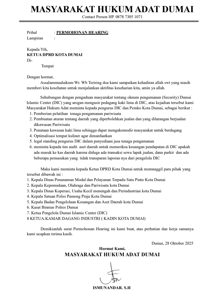 Masyarakat Hukum Adat Dumai, Ismunandar, menjelaskan bahwa pihaknya telah melayangkan surat resmi kepada DPRD Dumai sebagai permohonan untuk dilakukan Rapat Dengar Pendapat (RDP). Rapat ini bertujuan membahas insiden antara pedagang minuman air mineral keliling dengan oknum security DIC yang dinilai bertindak di luar batas dan mencoreng nilai kemanusiaan.